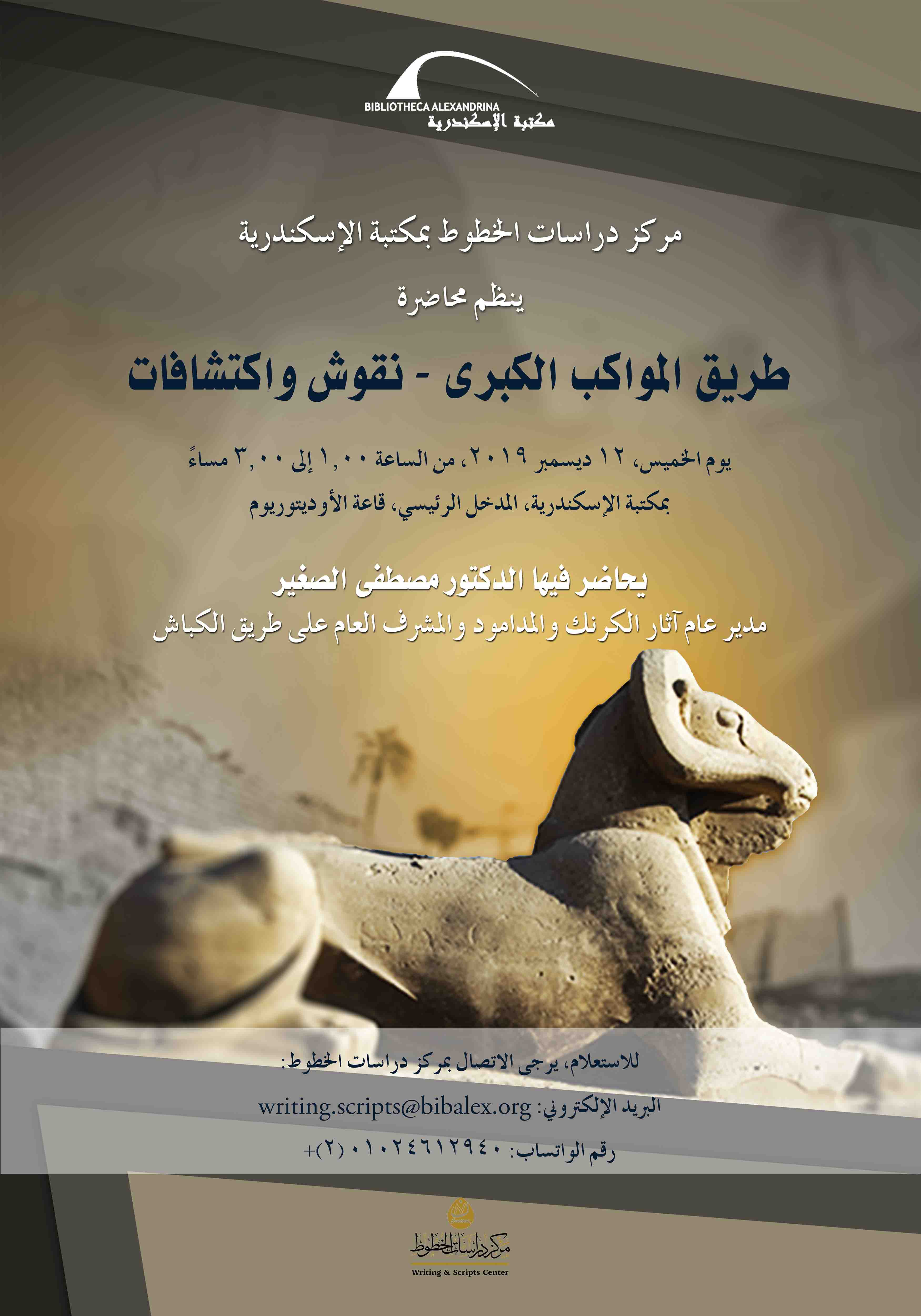 The BA Writing and Scripts Center organizes a lecture entitled “The Great Processions Road: Inscriptions and Discoveries” on Thursday, 12 December 2019, from 1:00 pm to 3:00 pm, at the Auditorium. It will be delivered by Dr. Moustafa Alsagheer, General Manager of Karnak and Madamoud Antiquities, and Supervisor of the Kebash Road.