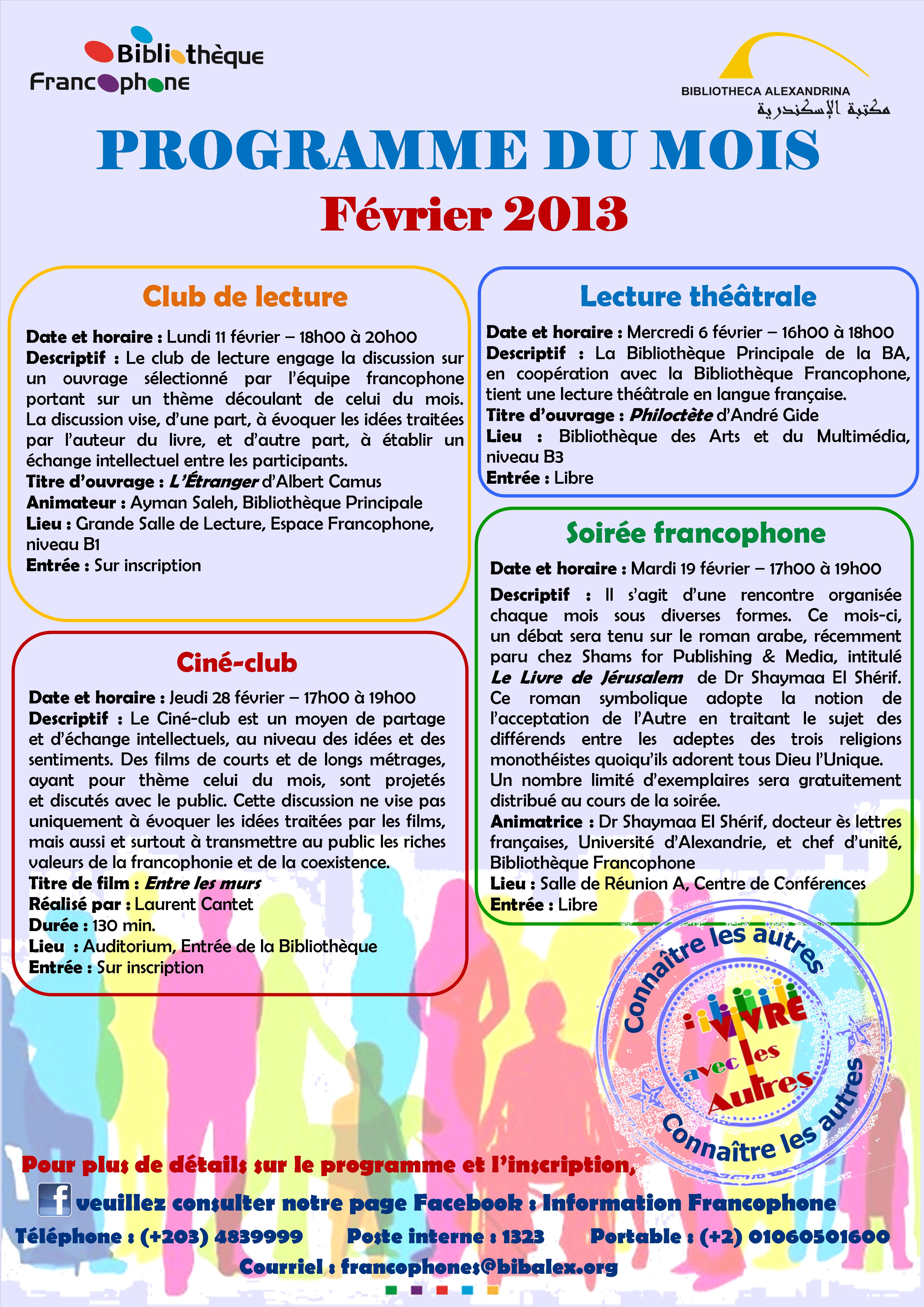 The BA Francophone Library scheduled a rich program for the year 2013, continuing on the work it started in 2012 in cooperation with the Sawiris Foundation for Social Development, under the theme “co-existence with the other”.