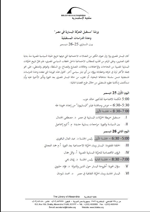 The BA Unit of Futuristic Studies holds on 25 and 26 December 2013 a workshop entitled “The Future of the Leftist Movement in Egypt” at the BA Cairo-based Sennary House.