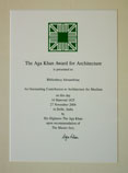 Son Altesse l’Aga Khan reconnaît des exemples d’excellence architecturale dans une conception moderne, des logements sociaux, amélioration et développement d’une collectivité humaine, restauration, réaménagement, respect du milieu, de même que les problèmes liés au paysage et à l’environnement. Depuis sa création, le Prix Aga Khan cherche à identifier et encourager les constructions qui ont réussi à répondre aux besoins et aspirations des sociétés dans lesquelles les Musulmans ont une présence significative. Le Prix Aga Khan a lieu tous les trois ans, il est dirigé par un comité directeur présidé par l’Aga Khan lui-même. Les prix totalisent 500 000 $US, le plus important prix d’architecture, ils présentent tous les trois ans des projets sélectionnés par un un jury indépendant. Le Prix a déjà récompensé huit constructions depuis 1977 et les archives contiennent plus de 7000 projets de construction situés dans le monde entier. Jusqu’à présent, le Jury a identifié 84 projets qui méritent de recevoir des prix.